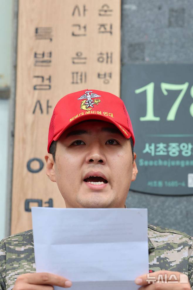 [서울=뉴시스] 권창회 기자 = 정원철 해병대 예비역연대 회장을 비롯한 회원들이 2일 서울 서초구 서초동에 마련된 순직해병 특검 사무실 앞에서 기자회견을 열고 발언하고 있다. 2025.07.02. kch0523@newsis.com