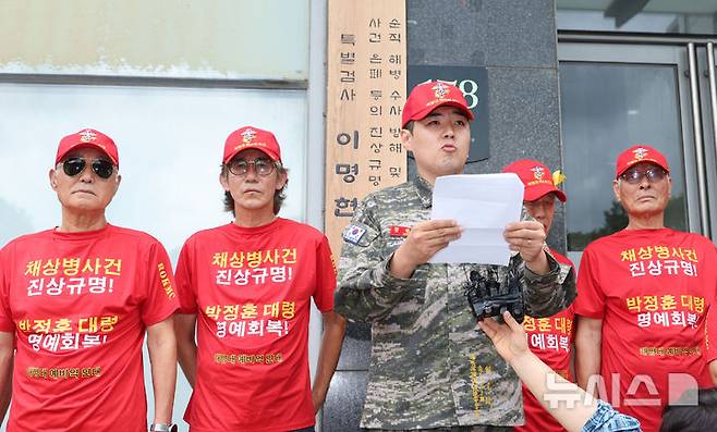 [서울=뉴시스] 권창회 기자 = 정원철 해병대 예비역연대 회장을 비롯한 회원들이 2일 서울 서초구 서초동에 마련된 순직해병 특검 사무실 앞에서 기자회견을 열고 발언하고 있다. 2025.07.02. kch0523@newsis.com
