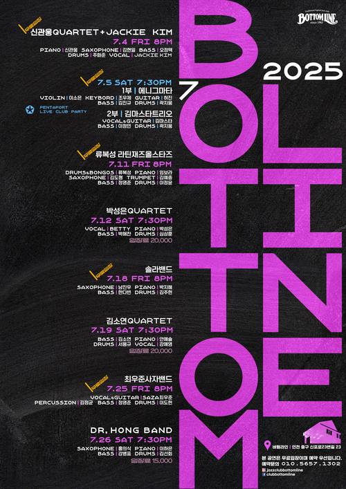 40년 넘은 재즈클럽 버텀라인은 인천시 라이브 공간 지원 사업에 선정돼 7월 한 달 동안 ‘2025 버텀라인 뮤직 웨이브’(Bottomline Music Wave)를 개최합니다. 매주 금요일 공연은 무료 입장입니다.