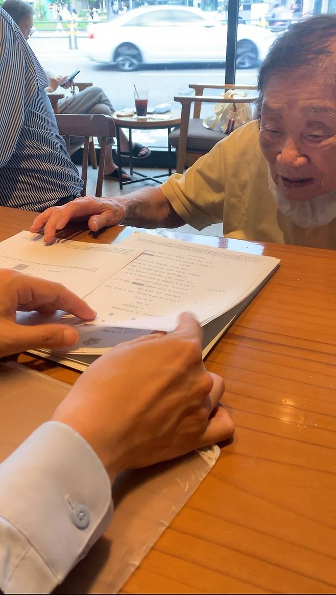 | ▲ 고 진두현 선생을 모란공원에 안장하기 전날 법률대리인을 만나 대법원 판결설명을 듣는 아내 박삼순씨. 휠체어를 끌고 일본에서 서울로 직접 왔다. |