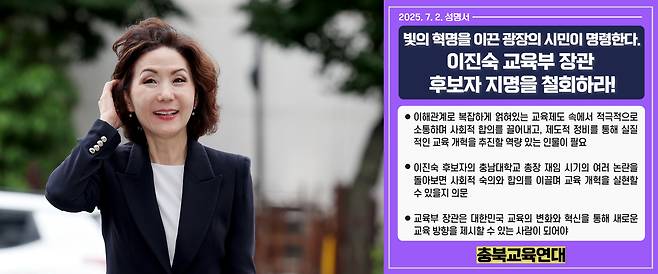 충북교육연대는 "많은 시민은 이재명 정부가 광장의 요구를 반영한 교육 개혁을 실현할 것이라 기대해 왔지만 이진숙 교육부 장관 후보자의 지명을 지켜보며 이재명 정부가 과연 교육개혁에 진정한 의지가 있는지, 이재명 대통령이 교육을 얼마나 중요하게 여기고 있는지 의문을 품지 않을 수 없다"고 했습니다.