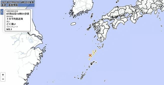 [2일 오후 2시 51분께 도카라 열도에서 발생한 규모 5.1 지진 (일본 기상청 홈페이지 갈무리=연합뉴스)]