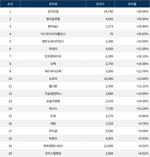 이밖에도 웰크론(065950) ▲11.22%, 지놈앤컴퍼니(314130) ▲10.99%, 오늘이엔엠(192410) ▲10.50%, 위닉스(044340) ▲10.24%, 우양(103840) ▲9.86%, 세동(053060) ▲9.78%, 자이글(234920) ▲9.56%, 씨큐브(101240) ▲9.53%, 에프엔에스테크(083500) ▲9.52%, 코아스템켐온(166480) ▲8.82% 등을 기록하며 금일 증시를 상승으로 마감했다.