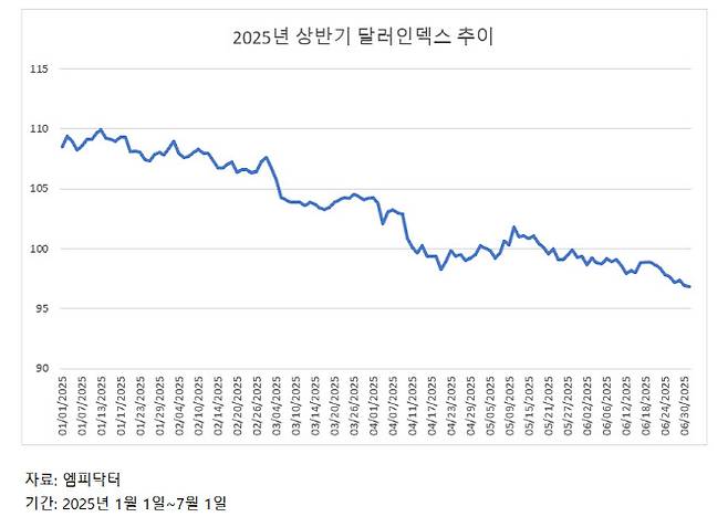 2일 엠피닥터에 따르면 파운드, 유로, 엔화 등 6개 주요 통화 대비 달러 가치를 나타내는 달러인덱스는 이날 새벽 2시(현지시간) 기준 96.78을 나타내고 있다. 전날에는 96.38까지 내려가며 지난 2022년 2월 이후 약 3년 5개월 만에 최저치를 기록했다. 올해 초 108~109를 오가던 달러인덱스가 반년 만에 10% 이상 하락한 것이다.