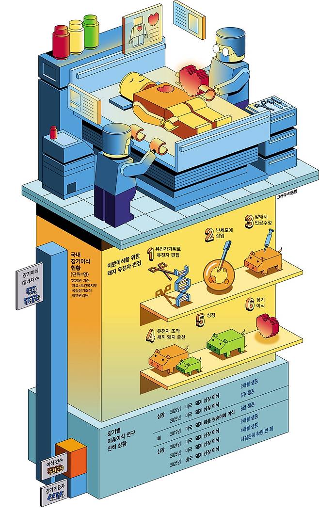 한 환자 모임 온라인 카페에서 심장 이식을 받았다고 소개한 A씨가 남긴 말이다. A씨처럼 심장 기능 이상으로 혈액을 제대로 공급하지 못하는 말기 심부전은 심장 이식만이 유일한 해결책이다. 심장뿐 아니라 간과 신장, 췌장 등 다른 장기도 '백약이 무효'일 때 최후의 방법은 다른 사람의 장기를 이식하는 것이다. 장기이식은 기약 없는 기다림의 연속이다. 한국장기조직기증원에 따르면 지난해 장기이식 대기자 수는 약 5만2000명이지만, 실제 이식 건수는 약 6000건에 불과하다. 4만명이 훨씬 넘는 사람들이 고통을 참으면서 언제 올지 모를 차례를 기다리고 있다. 과학계와 의료계는 수십 년간 이 문제에 매달렸다. 사람의 장기를 가져올 수 없으니 동물 장기를 활용하거나 인공장기를 만들 수는 없을까?