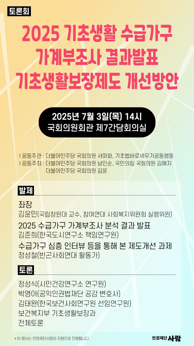 2일 국회 보건복지위원회 소속 서미화 더불어민주당 의원실과 시민단체 기초법바로세우기공동행동은 오는 3일 2시 국회의원회관 제7간담회의실에서 '2025 기초생활 수급가구 가계부조사 결과 발표·기초생활보장제도 개선방안' 토론회를 개최한다고 밝혔다.