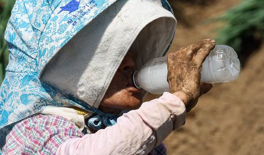 [무더위가 계속되며 폭염특보가 발효 중인 2일 경북 고령군 다산면의 한 밭에서 파 모종을 심던 농민이 얼음물을 마시며 더위를 식히고 있다. (사진=연합뉴스)]