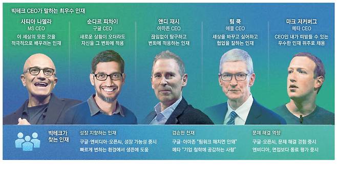빅테크 기업 CEO들이 강조하는 인재상을 살펴보면 공통점이 발견된다. 능동적으로 행동하면서 변화에 빠르게 적응하는 인재를 선호한다는 점이다. 사티아 나델라 마이크로소프트(MS) CEO와 순다르 피차이 구글 CEO는 원하는 인재상으로 '모든 것을 배우고 또 성장할 의지가 있는 사람'을 꼽았다.