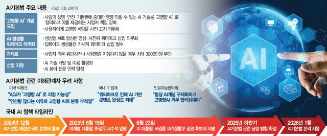 AI기본법은 산업 육성과 위험 관리 등 신뢰 기반 조성을 골자로 한다. AI를 생명·안전·기본권에 큰 영향을 미치는 ‘고영향 AI’와 ‘일반 AI’로 구분하고 고영향 AI 사업자를 대상으로 사전 고지와 검·인증 의무를 부여한다. 생성형 AI로 합성한 영상이나 사진에는 워터마크 삽입이 의무화된다.