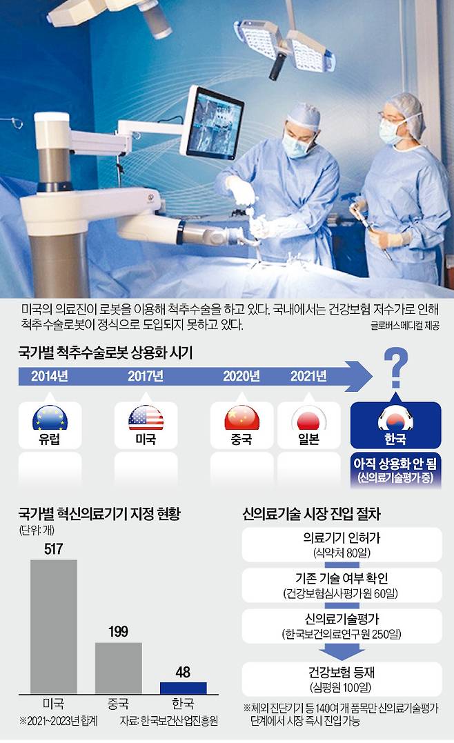 미국과 유럽, 호주에서 대중화한 척추수술 로봇도 한국에서는 정부 시범사업 외에 정식으로 도입한 병원이 없다. 척추디스크, 척추측만증 등이 있는 환자에게 필요한 척추유합술에 이 로봇을 활용하면 절개를 최소화할 수 있어 수술 후 회복이 30%가량 빨라지지만 역시 건보 저수가가 걸림돌이 되고 있다.