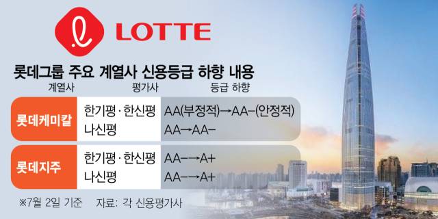 2일 금융투자 업계에 따르면 지난달 말 한국기업평가·한국신용평가·나이스신용평가 등 주요 신용평가사는 일제히 롯데케미칼의 신용등급을 하향 조정했다. 석유화학 업황 부진과 실적 회복 지연, 재무 부담 지속 등이 주요 사유다. 롯데케미칼의 신용등급 하락은 롯데지주·롯데캐피탈·롯데렌탈·롯데물산 등 주요 계열사의 신용등급도 줄줄이 내리는 연쇄 효과를 낳았다. 한국신용평가는 “롯데케미칼의 신용등급 하락으로 인해 지주의 통합기준신용도 자체가 하락했다”고 설명했다.