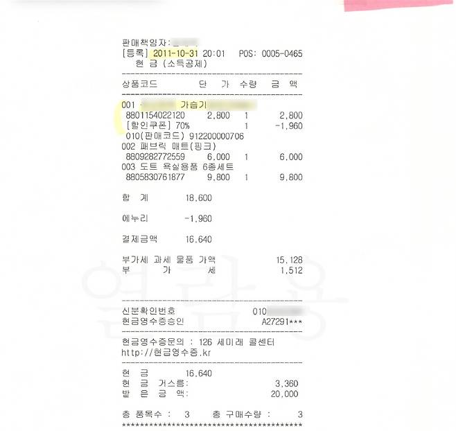 | ▲ K 씨가 가습기살균제를 구매한 영수증 사본. 이렇게 구매품목을 확인할 수 있는 영수증을 수집하기란 쉽지 않다. |