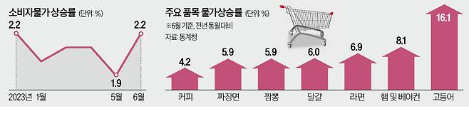 2일 통계청이 발표한 ‘2025년 6월 소비자물가동향’에 따르면 지난달 소비자물가지수는 전년 동월 대비 2.2% 상승했다. 전월(1.9%)보다 0.3%포인트 상승하면서 두 달 만에 다시 2%대로 올라섰다.