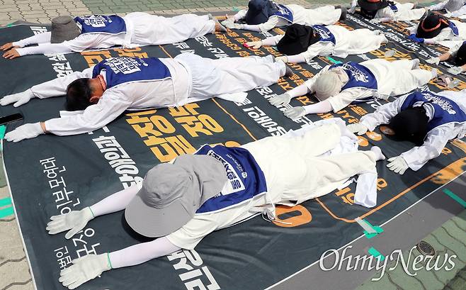 강씨의 옆에서, 오체투지 행렬의 선두에서 김종옥(63)씨도 몸을 엎드렸다.