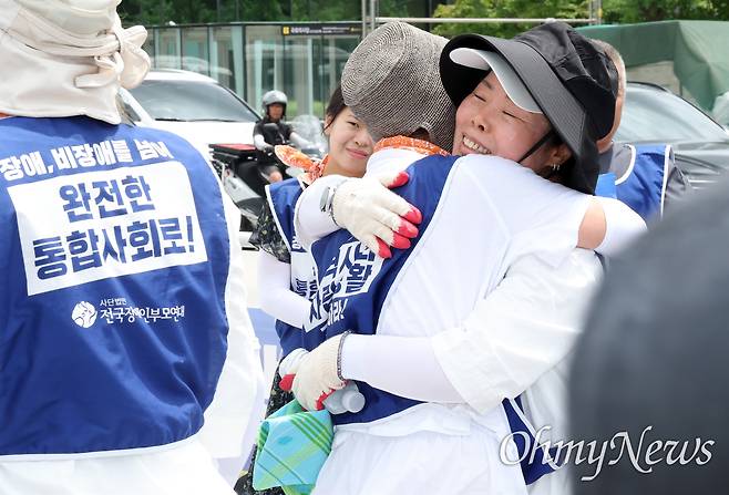 | ▲ 전국장애인부모연대 회원들이 2일 서울 여의도 국회 정문 앞에서 발달장애인 관련 예산과 권리 확대를 요구하며 오체투지를 한 뒤 서로 껴안으며 위로하고 있다. |