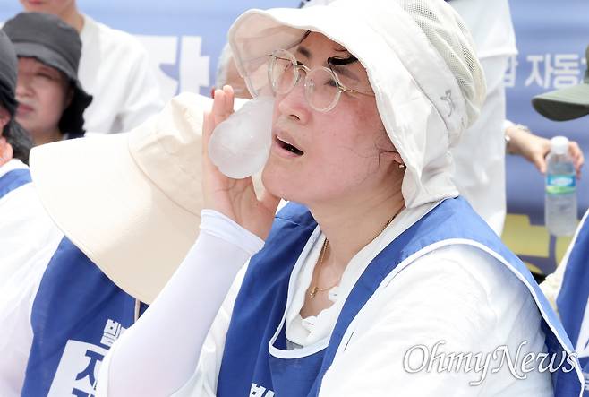 | ▲ 전국장애인부모연대 회원들이 2일 서울 여의도 국회 정문 앞에서 발달장애인 관련 예산과 권리 확대를 요구하며 오체투지를 한 뒤 얼음물로 더위를 식히고 있다. |