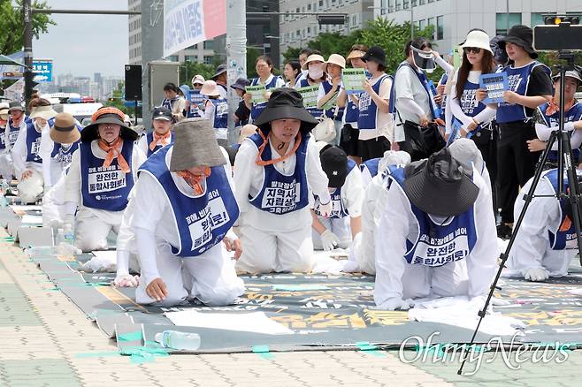 2일 오전 햇빛으로 한나절 달궈진 아스팔트 바닥이 폭염으로 펄펄 끓었다. 하얀 민복을 입은 부모들이 국회 앞 농성장에 네 줄로 늘어섰다. 한 줄에 열댓 명씩 50명의 부모가 가로세로 3m·30m 크기의 검은 매트와 천을 바닥에 깔고 3초간 바짝 엎드렸다. 둥둥둥 북소리가 네 개의 구호를 더했다. "발달!" "장애!" "권리!" "확대!" 32도 아스팔트 위로 땀이 뚝뚝 떨어지더니 검은 천을 더 새까맣게 적셨다. 발달장애 자녀를 둔 부모들의 오체투지가 11차례를 맞았다.
