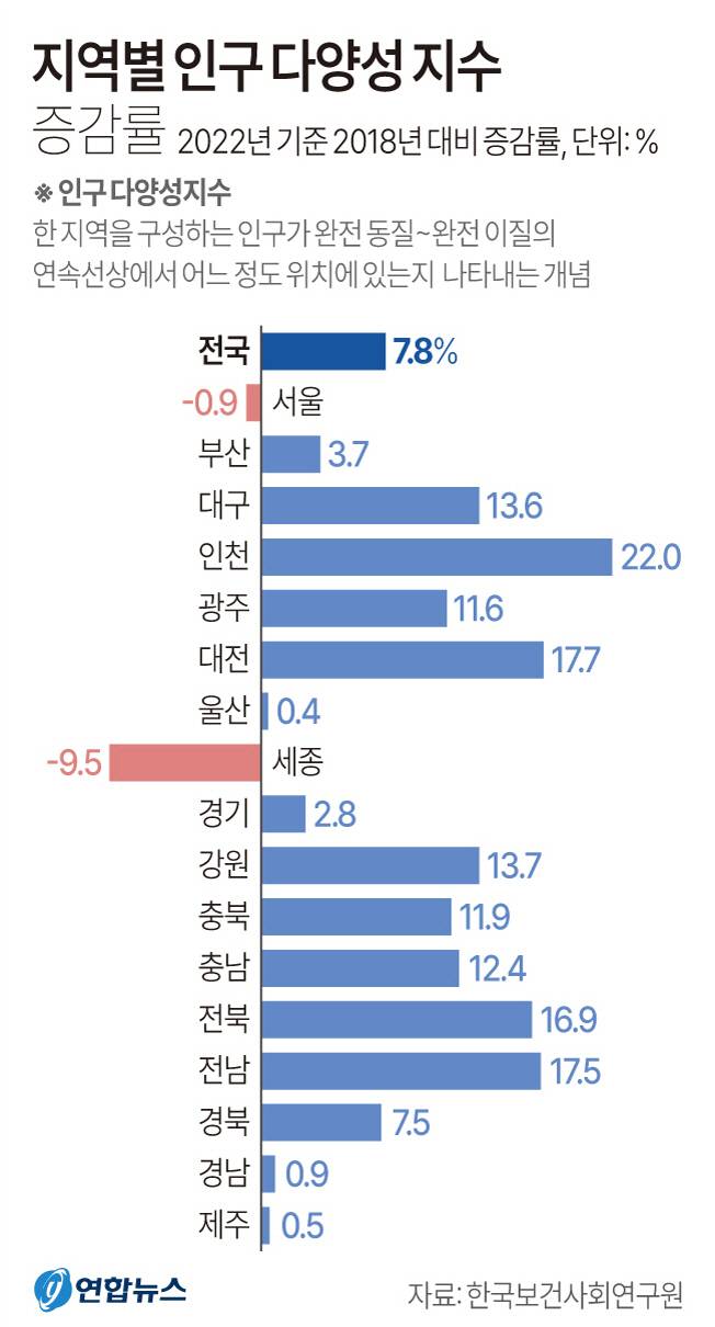 경상남도(0.87%), 울산(0.43%) 등 일부 지역은 증가 폭이 상대적으로 적었으며, 세종특별자치시(-9.49%)와 서울특별시(-0.92%)는 인구다양성 지수가 감소했다.