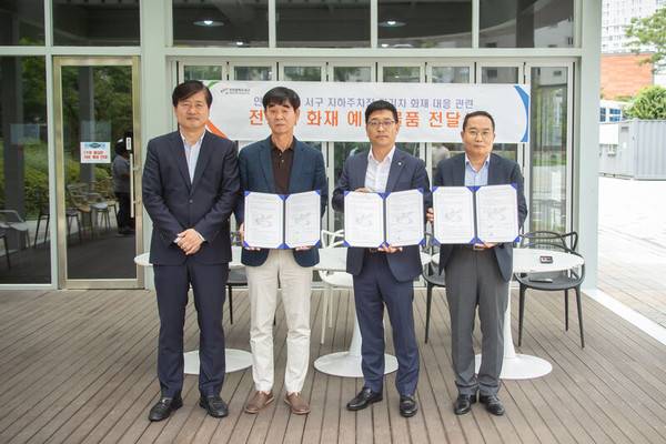 인천시 서구는 지난 1일 SG E&C, ㈜휴트로, 청라제일풍경채 2차 아파트 입주자 대표와 함께 '전기차 화재 예방 물품 전달식'을 개최했다.