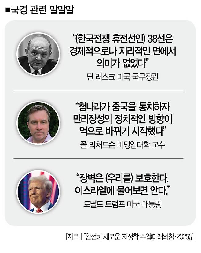 지리학자 폴 리처드슨은 「완전히 새로운 지정학 수업(미래의창·2025년)」에서 일반적인 의미의 국경을 이렇게 설명했다. "모든 국경은 경로를 결정하고, 어떤 사람이나 물건이 국경 안팎에 있는지, 누구에게 통과를 허락할지 결정하는 데 있어 타협을 수반한다(66쪽)."