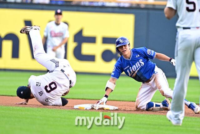 두산 오명진이 1회초 선두타자 삼성 김지찬을 2루에서 아웃시킨 후 충돌로 구르고 있다.