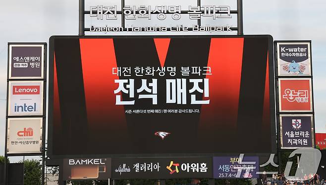(대전=뉴스1) 김기태 기자 = 2일 오후 대전한화생명 볼파크에서 열린 프로야구 '2025 신한 SOL뱅크 KBO 리그' 한화 이글스와 NC 다이노스 경기에서 전광판에 전석 매진 안내문이 보이고 있다. 2025.7.2/뉴스1