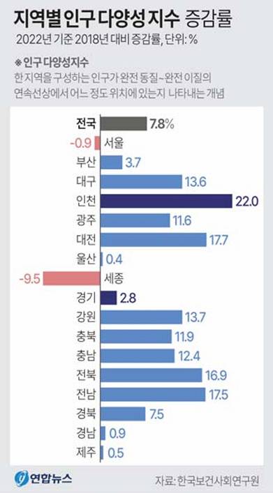 2일 한국보건사회연구원이 공개한 ‘지역별 인구다양성 지수 산출과 활용’ 연구보고서를 보면, 인천 인구 다양성 지수 증가율은 2018년 0.0592에서 2022년 0.0722로 22.0% 상승하며 전국에서 가장 높았다. 뒤를 이어 대전 17.7%, 전남 17.5% 순으로 증가율이 높았다. 전국 평균 인구 다양성 지수는 같은 기간 0.0527에서 0.0568로 7.8%의 증가율을 보였다. 반면 세종은 9.5%, 서울은 0.9% 하락했다.