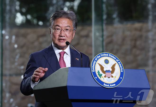 (서울=뉴스1) 사진공동취재단 = 조셉 윤 주한 미국대사대리가 2일 오후 서울 용산구 그랜드 하얏트 호텔 그랜드 볼룸에서 열린 미국 독립기념일 행사에서 기념사를 하고 있다. 2025.7.2/뉴스1
