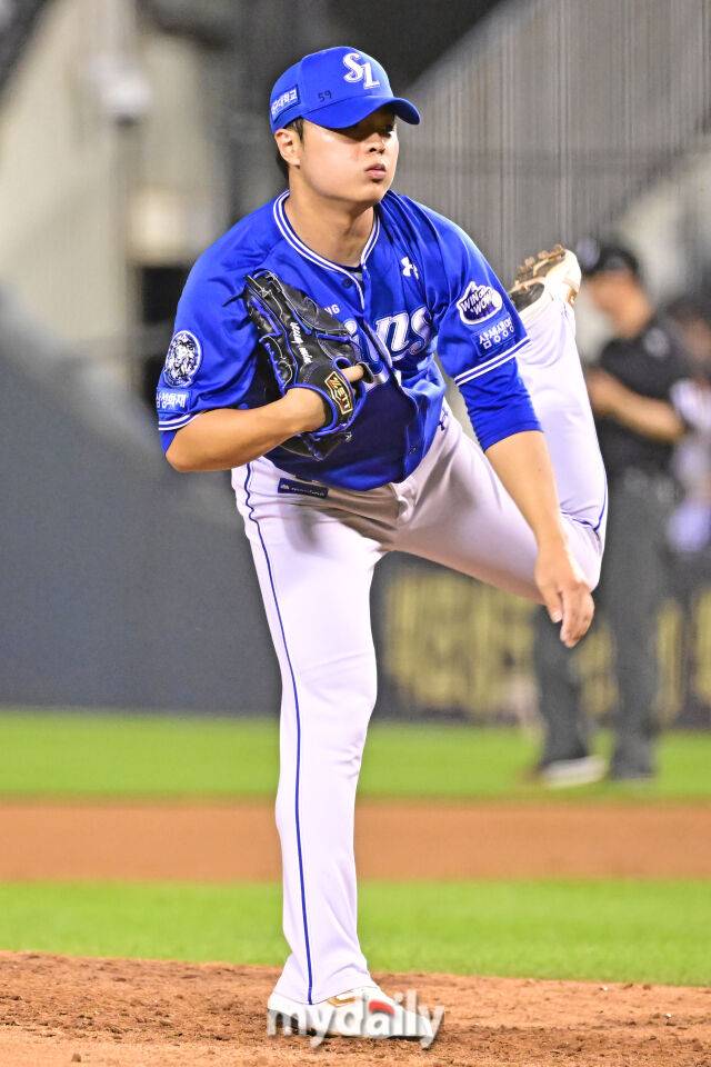 삼성 이승민이 6회말 교체되 마운드에 올라 힘차게 투구하고 있다.