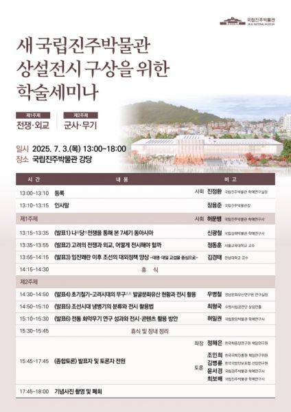 국립진주박물관은 3일 오후 1시 국립진주박물관 강당에서 2028년 개관 예정인 새 국립진주박물관의 상설 전시 주제 검토를 위한 학술 세미나를 개최한다.