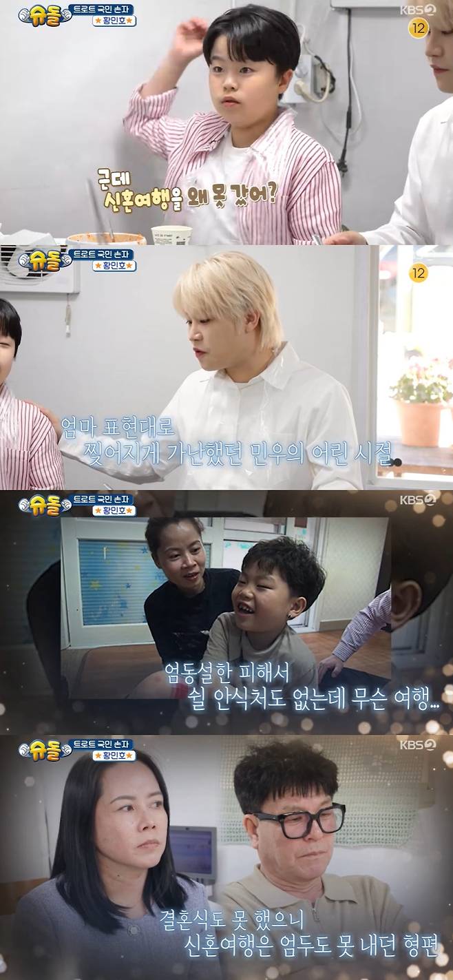 황민호는 "왜 신혼여행을 못 갔냐"라고 물었고, 황민우는 "형이 태어났을 때 얼마나 추운 집에 태어났냐. 보일러도 안 들어오고 따듯한 물도 안 들어왔다"라며 어려웠던 시절을 고백했다.