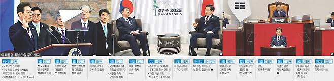 12·3 불법계엄 이후 6개월이 흐른 지난달 4일, 이재명 정부가 닻을 올렸다. 대통령직 인수 기간 없이 당선증을 받아든 즉시 직무를 시작한 이재명 대통령이 3일 취임 30일을 맞는다.