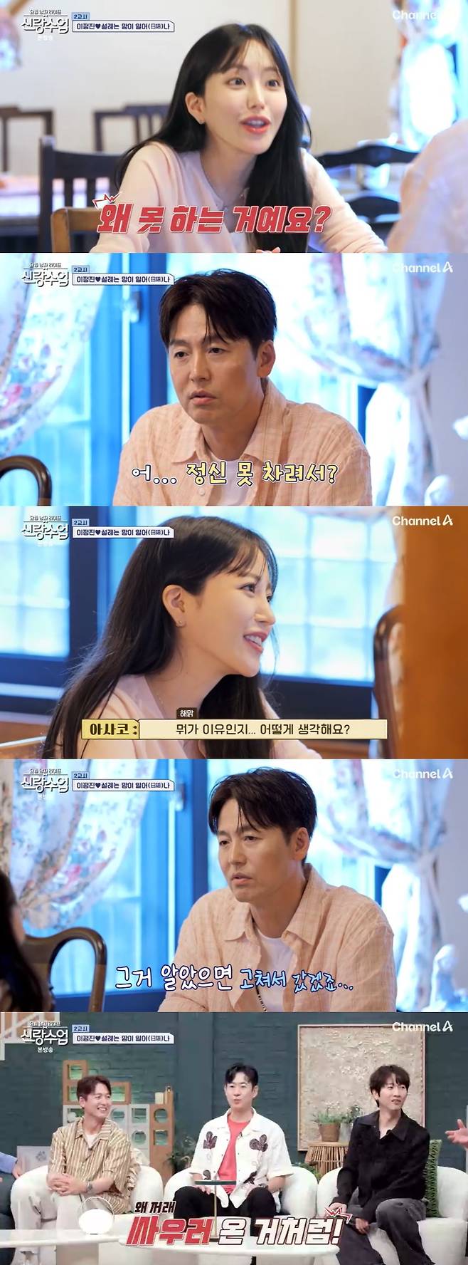 아사코는 "뭐가 이유라고 생각하냐"라고 물었고, 이정진은 "그거 알았으면 고쳐서 갔겠죠"라고 답했다. 이를 본 장우혁은 "싸우러 온 것 같다"라고 탄식했고, 이승철은 "말하는 태도를 바꿔야겠네"라고 조언했다.