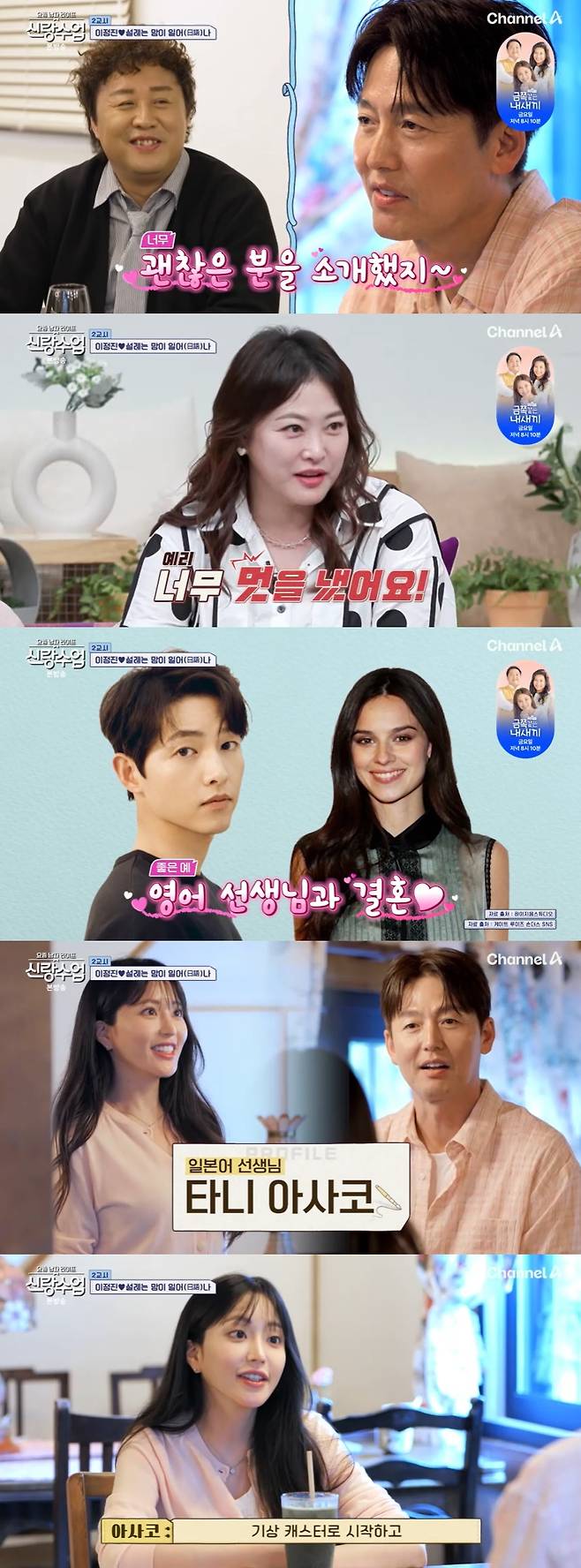 2일 방송된 채널A '요즘 남자 라이프 - 신랑수업'에서는 배우 이정진이 절친한 형 정준하로부터 일본 출신 방송인 타니 아사코를 소개받았다.