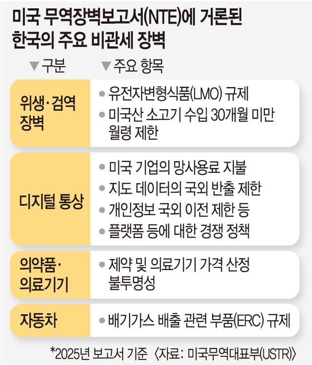 미국 무역대표부(USTR)는 소고기·감자 등 농축산물의 위생·검역 장벽과 디지털·의약품 규제 등을 한국의 대표적 비관세 장벽으로 거론하며 압박해왔다.