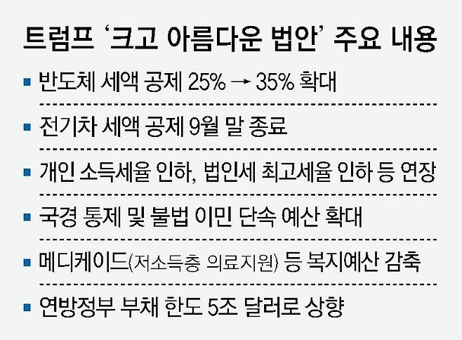 이 법안의 핵심은 트럼프 대통령이 집권 1기 때인 2017년 시행한 개인 소득세율 인하, 법인세 최고세율 인하, 자녀 세액공제 확대 등 각종 감세 조치를 연장하는 것이다. 국경 통제, 불법 이민 단속 예산 확대 등 트럼프 대통령의 ‘미국 우선주의’ 정책을 강조하는 내용도 포함됐다. 감세에 따른 재원을 마련하기 위해 고령자, 장애인을 위한 건강보험 ‘메디케이드’, 저소득층 식료품 지원 제도 ‘푸드 스탬프’에 관한 예산은 대폭 줄였다. 연방정부의 부채 한도는 기존 4조 달러보다 많은 5조 달러(약 6800조 원)로 높였다.