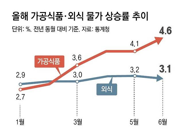 먹거리가 전체 물가 상승률을 크게 웃도는 오름세를 이어가면서 전체 물가를 끌어올렸다. 이재명 대통령이 “한 개에 2000원 한다는데 진짜냐”고 물었던 라면값은 지난달에도 전년보다 6.9% 올랐다. 2023년 9월(7.2%) 이후 가장 큰 상승 폭이다. 라면 가격은 올 4월부터 전년 동월 대비로 5% 넘는 상승률을 이어가고 있다.