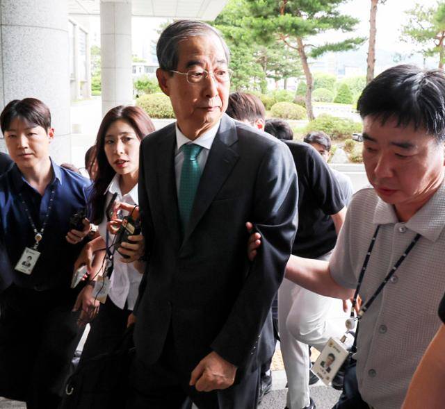 [오늘의 1면 사진] 팔 잡힌 채 출석하는 韓 전 총리