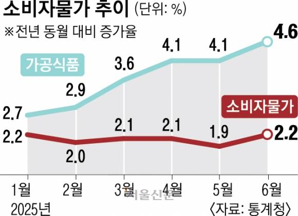 지난달 소비자물가 상승률이 두 달 만에 다시 2%대로 올라섰다. 특히 이재명 대통령이 콕 집었던 라면을 비롯한 가공식품 물가가 4.6%나 올랐다. 2023년 11월 이후 19개월 만의 최고치로 전체 소비자물가 상승률의 두 배를 웃도는 수준이다. 외식 물가도 3.1% 올랐다. 탄핵 국면에 도미노처럼 번진 식품·외식 가격 인상으로 서민들은 집밥도 외식도 부담스러운 상황이다.