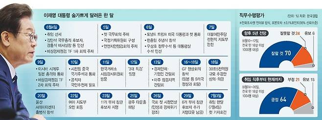전문가들은 취임 첫 달 이 대통령이 집권 첫 단추는 잘 끼웠다고 입을 모았다. 다만 이질적 인사들이 용광로처럼 섞인 내각이 빚을 효과나, 실용 외교의 진면목은 조금 더 지켜봐야 한다고 짚었다. 서복경 더가능연구소 대표는 “각 부처가 잘 조율돼 원하는 성과를 낳느냐, 충돌하느냐의 문제는 향후 평가받을 문제”라고 말했다.