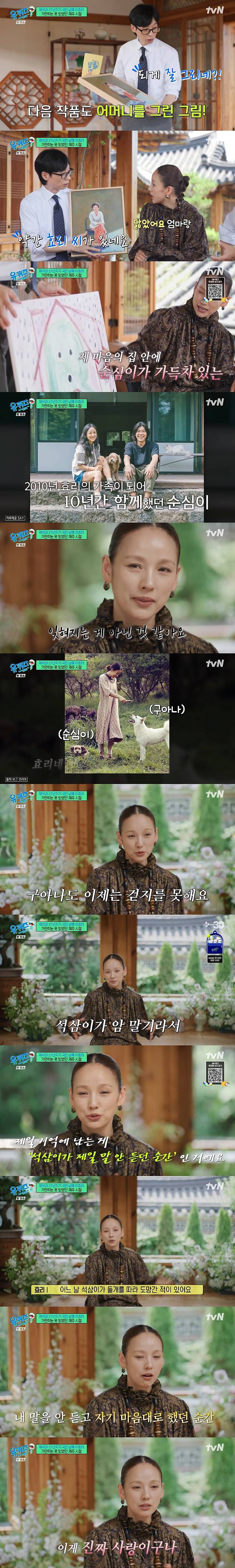 이효리는 직접 그린 그림을 소개하던 중 순심이의 그림을 보고 울컥했다. 그는 "강아지를 보내보신 분들은 알겠지만 잊혀지는 게 아닌 것 같다. 갑자기 눈물이 난다"며 눈물을 흘렸다.