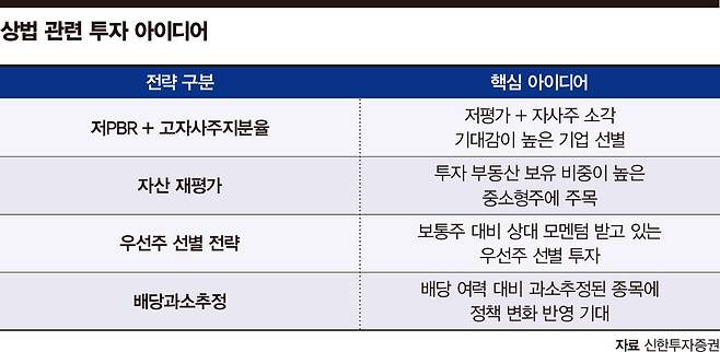 신한투자증권은 상법개정과 관련해 4대 투자전략으로 ▲자사주 ▲자산주 ▲우선주 ▲배당과소추정 관련주를 꼽았다. 이정빈 신한투자증권 연구원은 “상법개정 기대감이 고조되며 자사주 매입·소각 관련 수혜주에 대한 시장의 관심이 급격히 증가하고 있다”며 “이러한 배경 속에서 저PBR(주가순자산비율) 종목 중에서도 자사주 보유 지분율이 높은 기업군은 수급과 제도 이슈가 맞물리며 강한 주가 반응을 보이고 있다”고 설명했다.