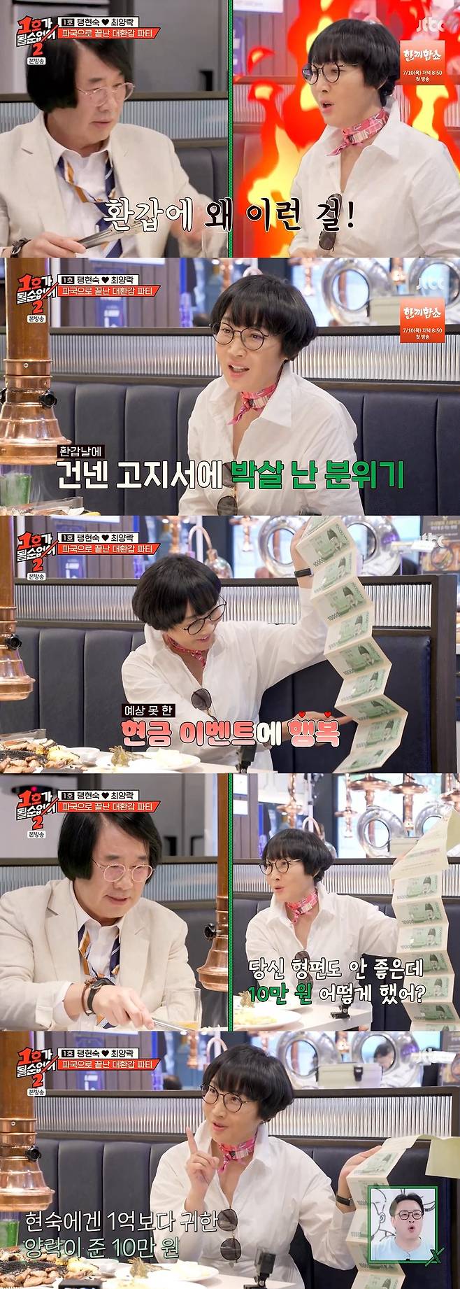 하지만 세금 체납서를 열어보자, 그 안에서는 줄줄이 이어진 만원 지폐들이 등장했다. 팽현숙의 환갑을 맞이해 최양락이 깜짝이벤트를 준비한 것.