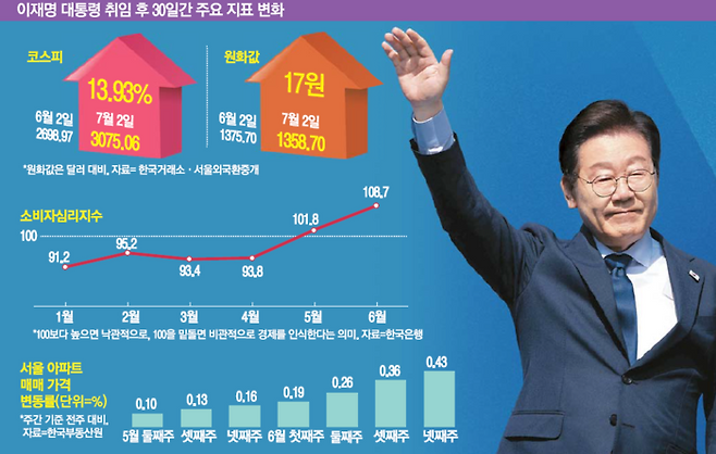 이 대통령 취임 후 지난달 4일부터 이달 2일까지 한 달 동안 코스피는 13.93% 올랐다. 지난달 20일에는 3년6개월 만에 3000선을 돌파한 데 이어 상승세를 이어 가고 있다. 달러당 원화값은 같은 기간 1375.70원에서 1358.70원으로 강세를 보였다.