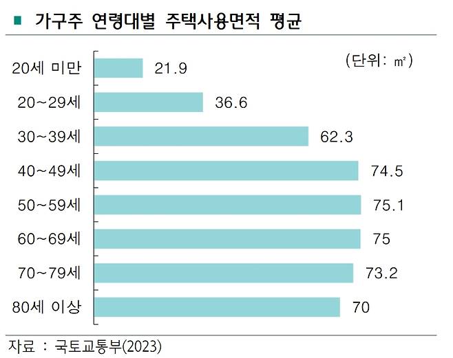 연령별로 차이가 있다. 사회생활 초년기에 해당하는 20대에는 전월세 보증금과 금융자산이 가계 자산의 핵심을 구성했다. 35세부터 부동산 비중(41.5%·2021년 기준)이 커졌다. 이후 부동산이 차지하는 비중은 70~74세 연령 그룹(63.8%)까지 상승하다가, 75세(61.8%)가 넘어서야 소폭 하락했다.