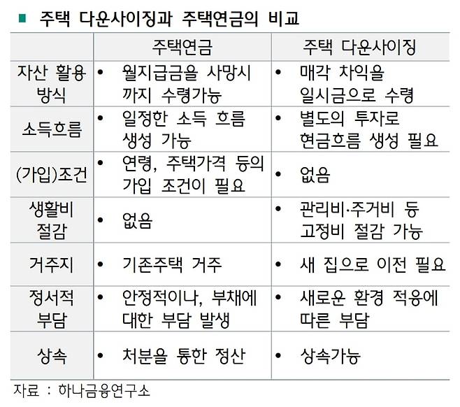 하나금융연구원은 ‘고령화 시대, 주택 다운사이징의 현황과 과제’에서 “주택 다운사이징은 주택연금 가입 자격이 되지 않거나 보다 유연하게 자산을 활용(투자·상환·상속 등)하고자 하는 고령층에게 좋은 대안이 될 수 있다”고 했다.