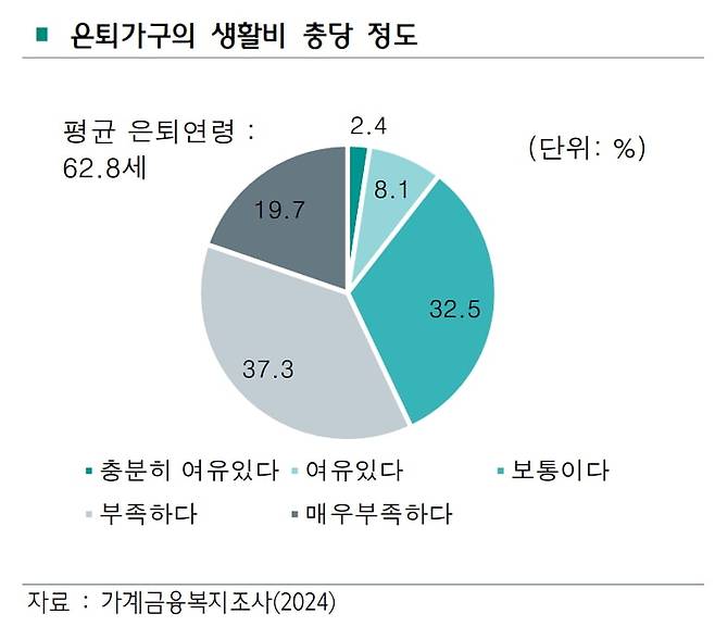통계청의 ‘2024년 가계금융복지조사’에서도 은퇴 가구의 37.3%는 ‘생활비가 부족하다’고 답했다. ‘매우 부족하다’는 답변도 19.7%였다. ‘보통이다’는 32.5%, ‘여유 있다’는 8.1%, ‘충분히 여유 있다’는 2.4%였다.