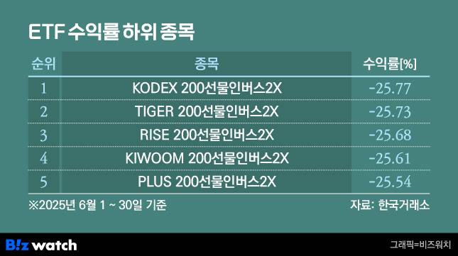 월간 수익률 최하위는 삼성자산운용의 KODEX 200선물인버스2X(-25.77%)였다. 그 다음 미래에셋자산운용의 TIGER 200선물인버스2X(-25.73%), KB자산운용의 RISE 200선물인버스2X(-25.68%), 키움투자자산운용의 KIWOOM 200선물인버스2X(-25.61%) 등이 뒤를 이었다.