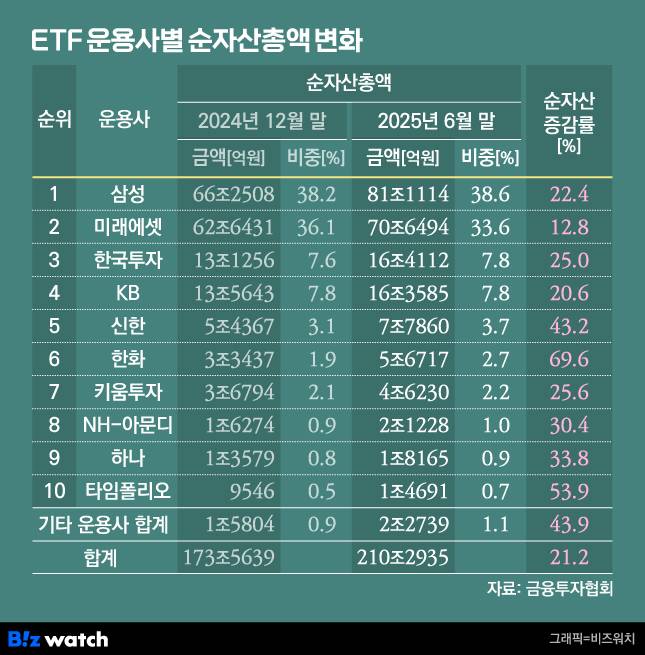 올해 상반기 국내 상장지수펀드(ETF) 시장의 순자산총액이 210조원을 넘어섰다. ETF 시장 각축전에서 운용사들은 미국 대표지수(미국 S&P500·나스닥100)와 금현물 ETF 보수 등을 앞다퉈 인하하며 경쟁을 펼쳤다.