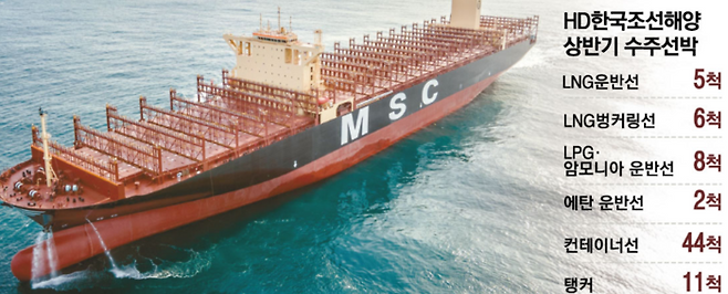 HD한국조선해양은 올해 들어 6월까지 선박을 총 76척(105억달러) 수주했다. 이는 지난해 상반기 수주(121척)보다 62.8% 줄어든 규모다. 다만 보수적으로 설정한 연간 수주 목표의 절반을 넘어 58.2%를 달성했다. 수주 선박별로 살펴보면 △액화천연가스(LNG) 운반선 5척 △LNG 벙커링선 6척 △액화석유가스(LPG)·암모니아 운반선 8척 △에탄 운반선 2척 △컨테이너선 44척 △탱커 11척 등이다. HD한국조선해양은 HD현대중공업·HD현대미포·HD현대삼호 등 조선 계열사를 자회사로 두고 있는 중간지주회사다.